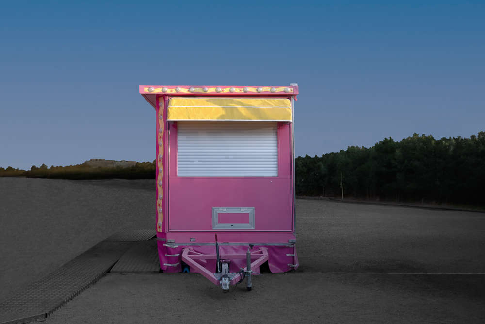 Ce qui frappe dans la série photographique de Michel Rey, mémoire de fête, c’est la tension, entre l’esthétique kitsch des baraques foraines, de couleurs vives voire criardes, aux enseignes accrocheuses, et la construction frontale et rigoureuse de leur représentation. Ces baraques à l’esthétique naïve et modeste voient leur beauté plastique dévoilée par des prises de vue au petit jour, devantures fermées sans aucune présence humaine, et par un travail d’effacement de tout élément parasite. Soustraction du réel qui rend visible les lignes de force de leur arrière-plan et de leur socle. Le connaissable, l’habituel est détourné pour opérer une métamorphose poétique et onirique, métaphore d’un monde précaire, annonce nostalgique d’un avenir incertain.
